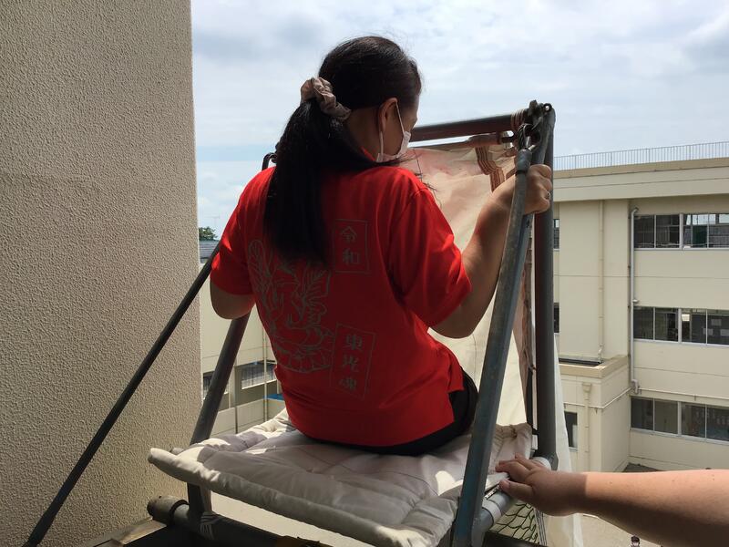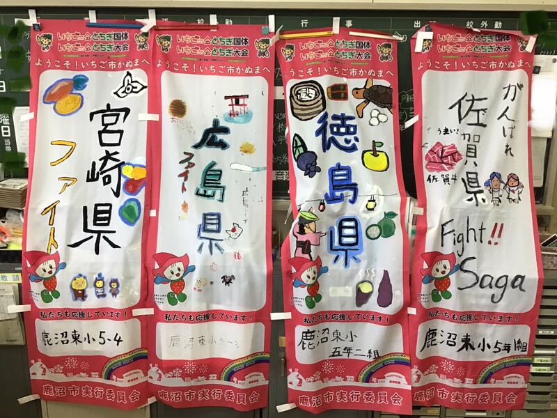 大会を盛り上げるため、各小中学校では各都道府県の選手や関係者を「ようこそ!いちご市かぬまへ」と歓迎するとともに、応援もする「のぼり旗」を作っています。本校には7つの県の応援旗作成のオファーがあり、5、6年生が分担して作成しました。