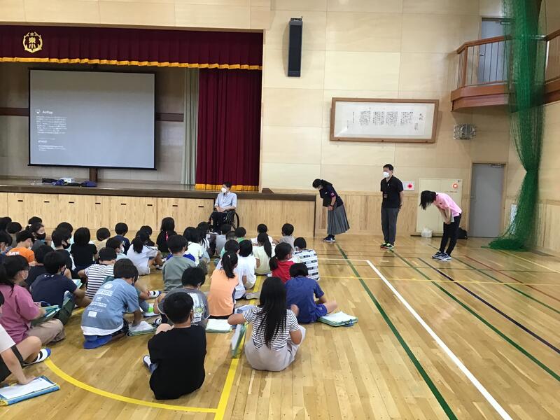 4年生の総合的な学習の時間の体験学習として、市社会福祉協議会の職員とボランティアの5名の方々にお越しいただき、車椅子体験を午前中、体育館で行いました。5学級のため、3回に分けての実施でした。