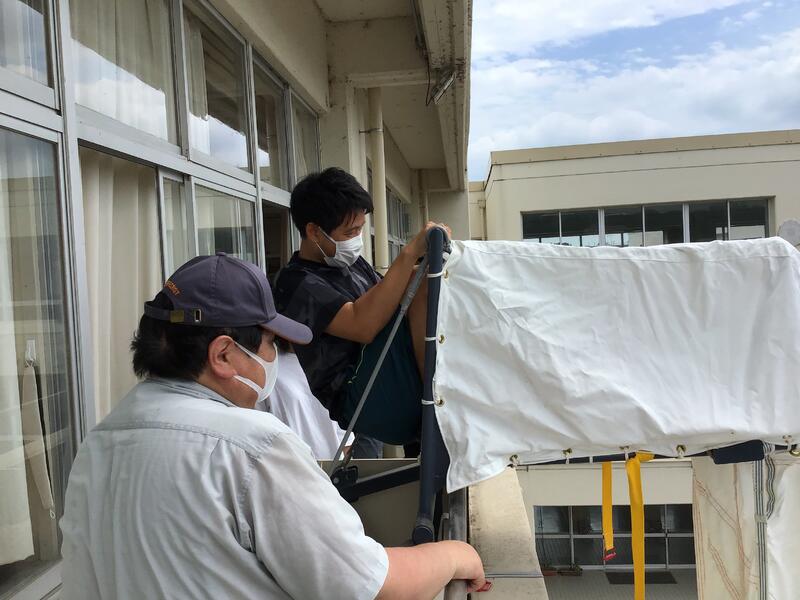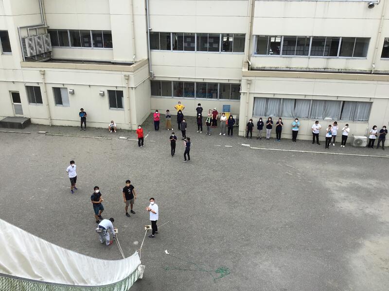 今日も職員みんなで、いろいろなことに取り組みました。午前の前半は、2学期早々に県と市の教育委員会事務局の訪問でご指導を受ける授業の検討を行いました。後半は防火関係の業者点検に合わせて、避難用救助袋の使用訓練を行いました。本校には、校庭と昇降口前と中庭に3階から降りられる救助袋があります。真下に降りるタイプと斜めに滑るタイプの2種類です。
