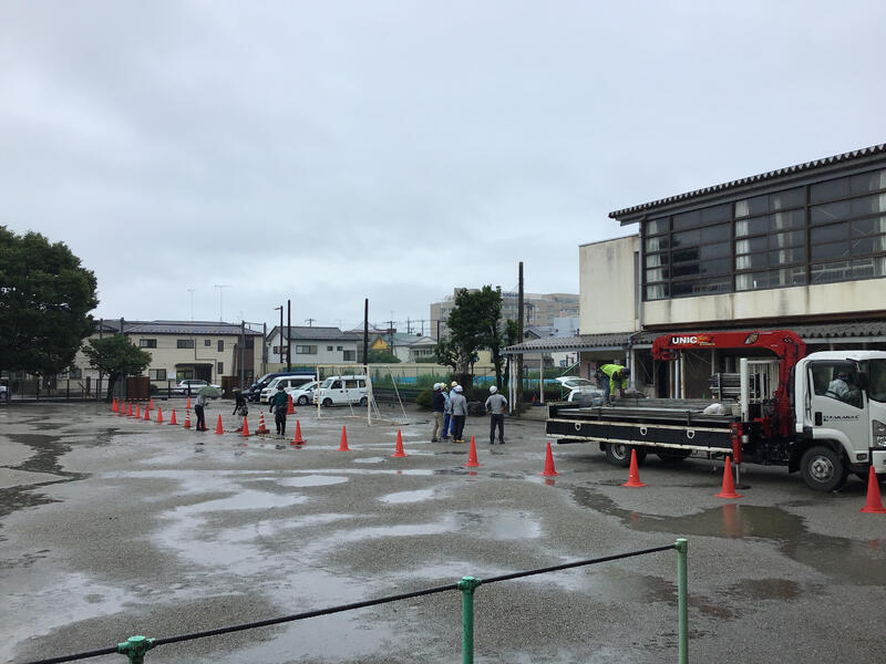 校庭西側のサッカーゴールは移動され、陸上競技用のトラックにフェンスがかかる状態です。