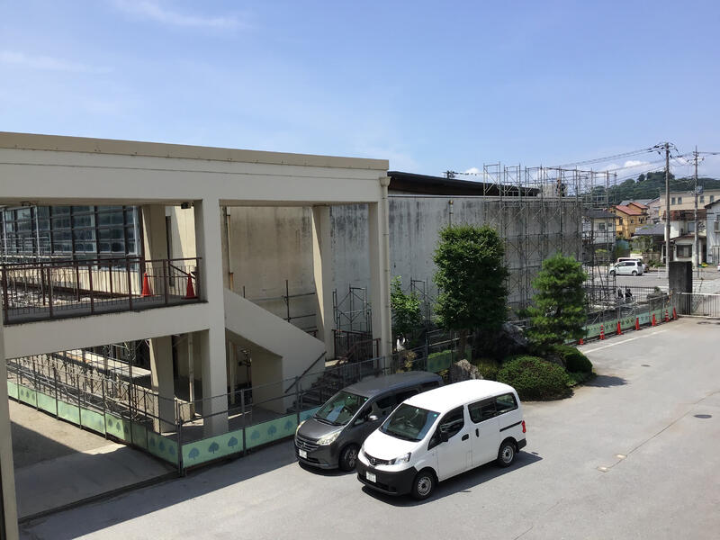さて、本日の学校はといいますと、体育館工事が4週間目に入りました。今日、館内に掛かっていた校歌や絵画の大きな額が外され、校舎の方に運ばれました。足場が組まれ幕が張られているため、詳しい中の様子は見ることができません。連日猛暑の中作業をされていることを察すると作業される方々には大変なご苦労がかかっていることと思います。