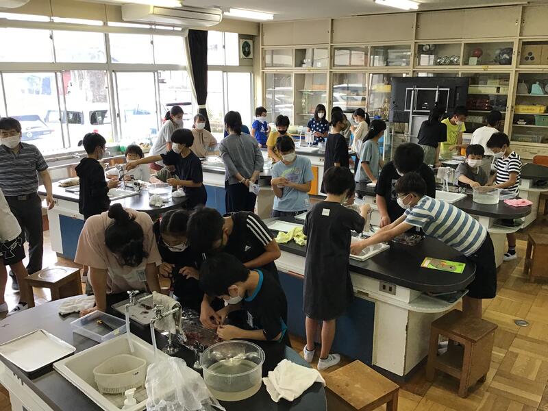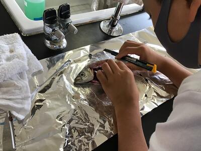 サバの体はほとんどが筋肉であるということや、人と共通の臓器があること、人には無いエラの存在や心臓や脳が小さいということなどを確かめることができたようです。またオスとメスの違いも解剖することで明らかになりました。積極的にハサミや包丁を使う子や少し尻込みしている子など反応は異なりましたが、皆一様に高い興味関心があることが目の輝きに表れていました。
