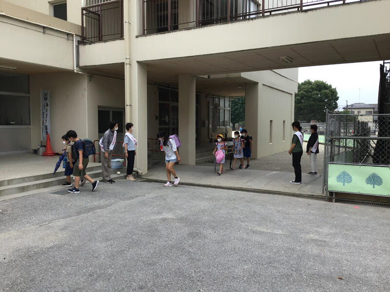 今朝は、東部地区青少年育成市民会議の皆さんが、今年度5回目のあいさつ運動を行ってくださいました。本当に暑い中ありがとうございました。明日から長期休業となります。地域の皆様の見守りとご指導をいただきながら、子供達が健康的で安全な夏休みが過ごせますようどうかよろしくお願いいたします。