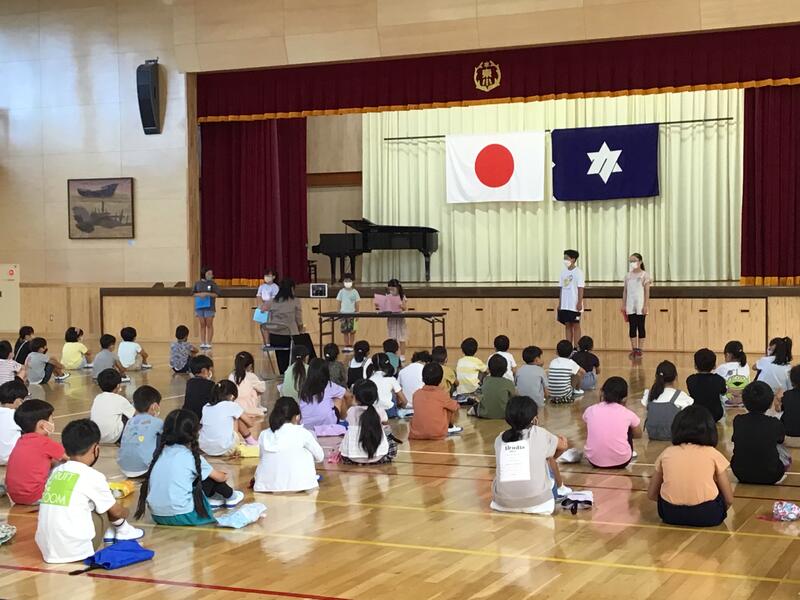 39日間の夏休みが明け、心なしか涼しい朝、子供たちの元気な姿で学校に戻ってきました。始業式は、1年生から4年生までの1クラスずつが体育館で参加し、他学級、学年は教室でリモート参加しました。