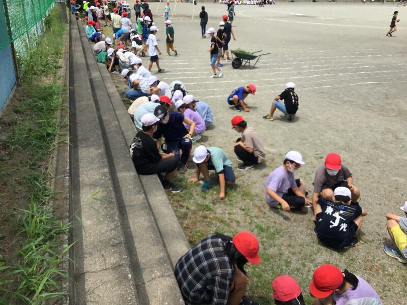 先月予定した「クリーンタイム」は、暑さで取りやめになりました。今日は熱中症指数も問題なく、全校児童による除草・石拾い作業(クリーンタイム)を清掃の時間に行いました。15分という限られた時間でしたが、学年ごとに割り振られた場所で活動することできました。