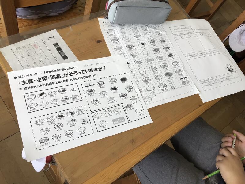 2週間後には夏休みが始まります。今日は、6年生が学級活動で学校栄養士を講師に迎えて「食事の基本形態」を学習しました。紙上でバイキングをして好きな献立を作ったり、学校給食の献立が基本形態に沿って作られていることを確認したりしました。担任の先生も、自分の好きな食事メニューのバランスをチェックしていました。