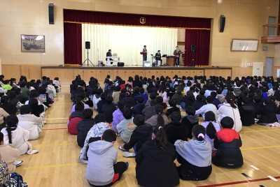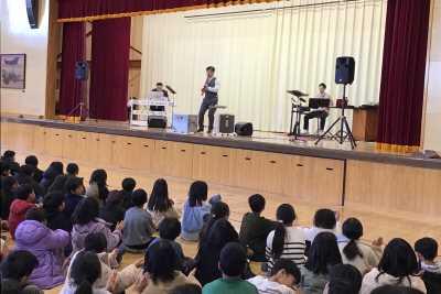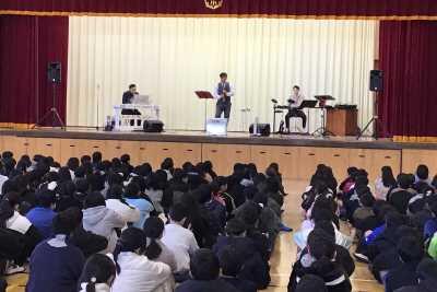 IWASHIYA(いわしや)というバンドの方々3名による生演奏を鑑賞しました。尺八、電子ピアノ、電子ドラムといった異色の取り合わせが奏でるメロディに子どもたちは釘付けで、自然と手拍子や歌声が沸き起こりました。本校の飯野先生とのコラボ演奏もあり、みんなで盛り上がりました。