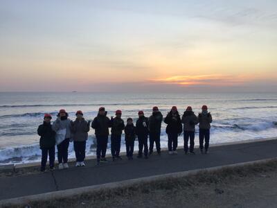 海岸は冷えた空気の中、子供たちは朝からみんな元気です。
