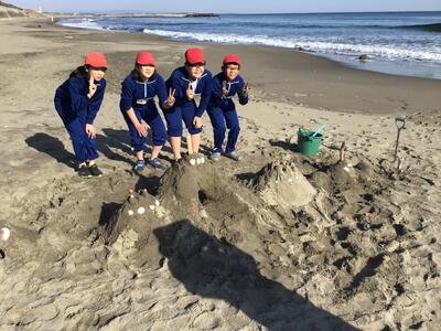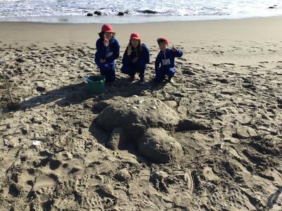 各班で、協力して、砂の造形に挑戦しました。生き物やキャラクターを砂で立体的に表現しました。たくさんの砂を盛り上げて、イメージした作品が出来上がったようです。