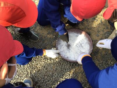 その後は、潮くみリレーを行いました。くんだ海水は午後の塩づくりで使います、。