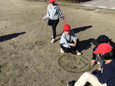 こちらの子供たちは、なわとびから、地面にお絵描きが始まりました。