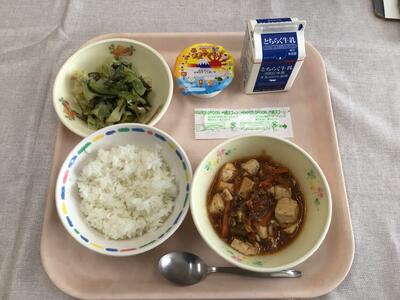 献立:ごはん、マーボーどうふ、まるごとわかめサラダ、牛乳、しんしゅんゼリー