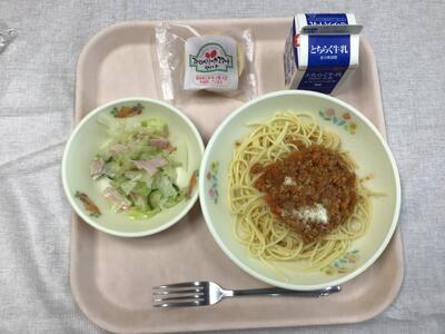 献立:スパゲティミートソース、ハムマリネサラダ、牛乳、ストロベリーカスタードタルト