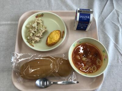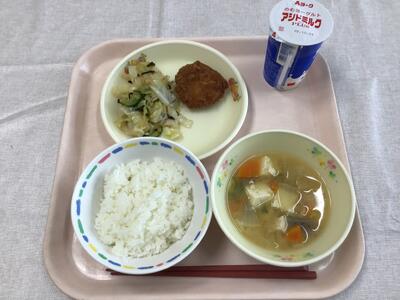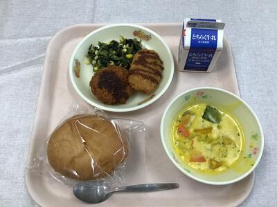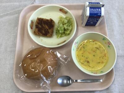 献立:まるパン(スライス)、じゃこカツ、キャベツのカレーソテー、コーンポタージュ、牛乳