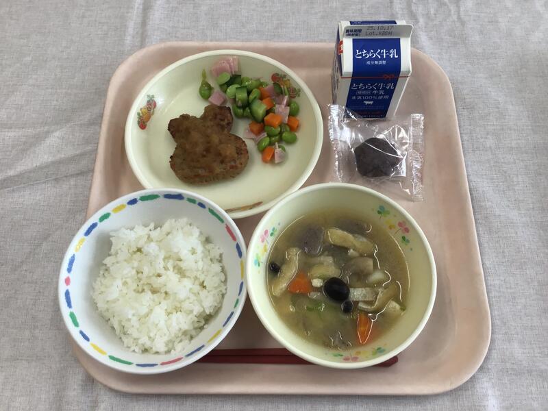 献立:ごはん、ハンバーグおろしソースがけ、えだまめサラダ、いなかじる、牛乳、おはぎ
