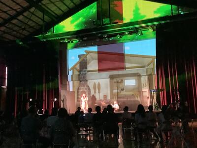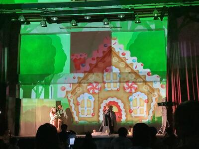 演目は「ヘンゼルとグレーテル」です。指揮者のタクトに合わせ、素晴らしい歌声と演技、そしてプロジェクションマッピングと映像が一体となり子供たちは目が釘付けでした。プロジェクションマッピングとは、実物〈リアル〉と映像〈バーチャル〉をシンクロさせる映像手法です。