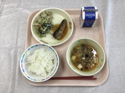 献立:ごはん、イワシのおかかに、こまつなとごぼうのあえもの、さわにわん、牛乳