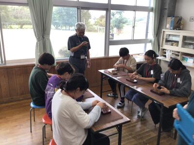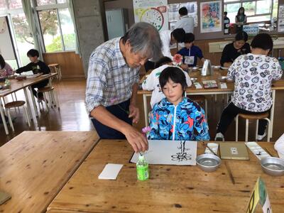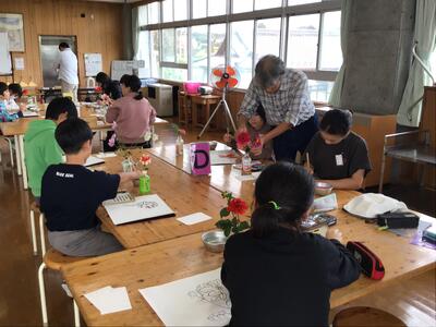 先生が花や収穫したさつまいも、柿などの絵になる材料を持ってきてくださりそれを自分で選びました。対象物をよく見て、墨で絵の輪郭をとり、その後専用の絵の具「顔彩」で色を塗り、言葉(文)を載せました。子供たちは集中して作品を作り、中には一人で5枚も仕上げる子もいました。