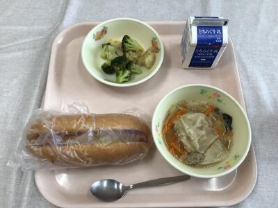 献立:チーズホットドック、ブロッコリーサラダ、ワンタンスープ、牛乳