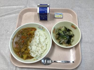 献立:もちむぎごはん、ポークカレー、こんにゃくサラダ、牛乳、チーズ