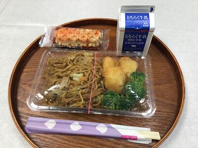 献立:セルフかきあげどん(ごはん、やさいかきあげ)、わふうあえ、まんてんみそしる、牛乳
