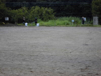 AM6:30 作戦開始。予定どおり、校庭の除草剤散布から始める。