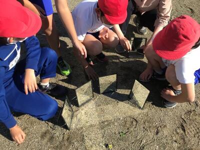 昨日、1,2年生がビオトープをきれいに掃除してくれたばかりで、とてもきれいな氷ができました。