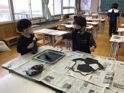 図工担当の教員から、お話を聞いたあとは、友達と協力しながら版画を仕上げていきました。