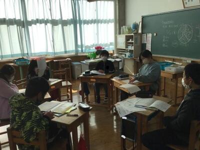 コロナの感染レベルが上がったため、終業式はオンラインで各教室をつなぎ実施しました。