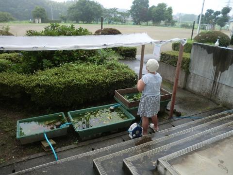 今朝は、1年生が朝顔の世話をしていました。はやくグリーンカーテンができるといいですね。ビオトープでは、6年生がメダカに餌をあげていました。いきものたちが元気に育っています。