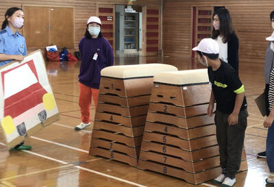 今年度の交通安全教室は、トラック巻き込み訓練です。