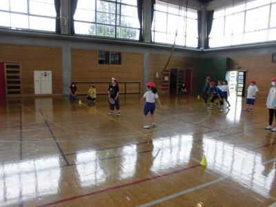 体育館が狭いので、ひと班を半分に分け、4つの班をつくりました。
