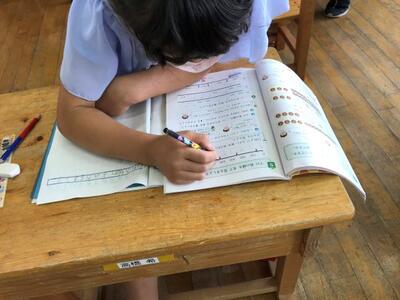 1年生はプリントが終わると、先生にまるをつけてもらい、ファイルにとじました。