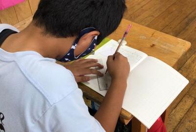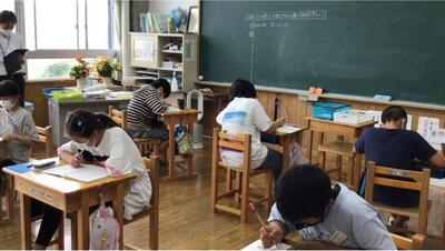 5年生が、算数の問題を解いていました。先生は、6年生を指導中でした。