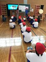 また、運動会の「お囃子」と「よさこいソーラン」で着る法被(はっぴ)も、実行委員が皆に披露しました。青い法被は1~5年生、赤い法被は6年生です。