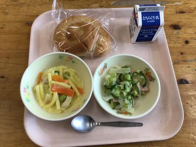 献立:おおむぎごはん、牛乳、チキンカレー、こんにゃくサラダ