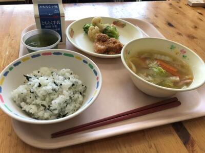 わかめごはん、牛乳、鶏のから揚げ、白菜スープ、花野菜サラダ、メロンゼリー