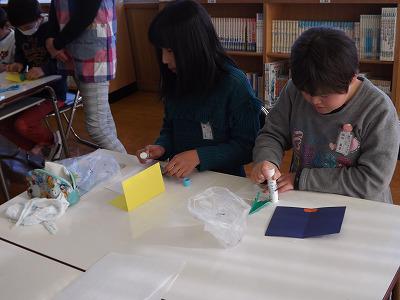 クリスマスカード作り 投稿日時 : 2017/12/18 教員 出雲図書館支援員の指導の下、クリスマスカード作りを行いました。 シールや飾りをカードのクリスマスツリーに貼り付けて、彩り豊かな思い思いのクリスマスカードに仕上げました。メッセージを書いている子どももいました。 完成したカードを互いに見せ合う姿があちこちで見られ、「とっても楽しかった!」という声が聞かれました。