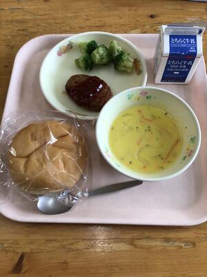 本日の献立 セルフバーガー(まるパン)、ハンバーグケチャップがけ、ボイルブロッコリー、コーンスープ、牛乳