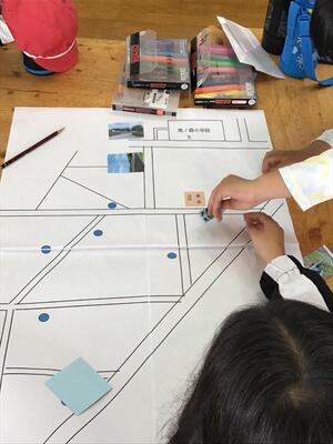 学校へ戻ってから、食堂に集まり、6年生を中心にみんなで協力して安全マップ作りを行いました。