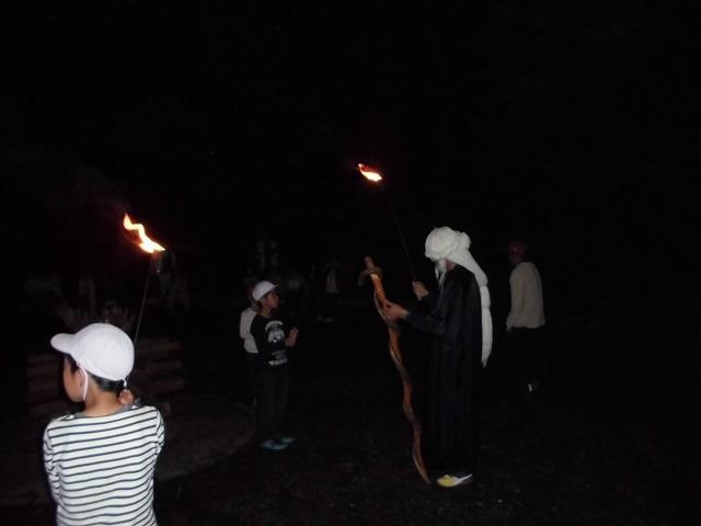 夜は、キャンプファイヤーを行いました。雨も上がり、津田小学校の4年生と共に、大盛り上がりで、楽しいひとときを過ごしました。