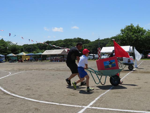 子どもたちが考えた応援合戦では大いに盛り上がり、プログラムは順調に進みました。今年リニューアルした親子種目「おやこ宅急便」では、保護者と子どもが協力して一輪車で荷物を運びました。中には息が合わず荷物を落としてしまう親子もいて、会場の笑いを誘いました。