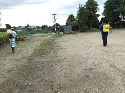 AM6:30 作戦開始。予定どおり、校庭の除草剤散布から始める。