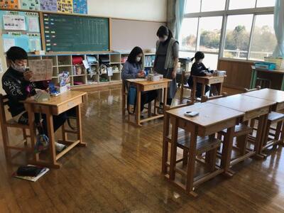 卒業した6年生の机がまだ教室に残っていて、いつもより静かに感じられました。