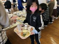 4時間目終了のチャイムがなると、間もなく1年生から順に、児童が食堂に集まってきました。
