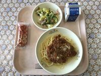 スパゲティミートソース、牛乳、フレンチサラダ、チーズドック
