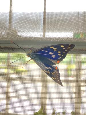 池ノ森学でお世話になっている講師の先生から、先日オオムラサキの幼虫をいただきました。ほどなくして、さなぎになり羽化する日を子どもたちと楽しみにしていました。昇降口の靴箱の上の飼育箱をみんな覗きながら帰っていました。