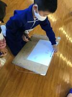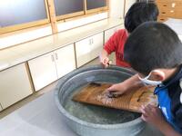 二つ目は木はん画です。ぼくは始める前、指を切ったらどうしようと、とても心配でした。ためしぼりをしたとき、両方の手でちょうこく刀を使えばだいじょうぶと分かりました。それで、楽しくほることができました。