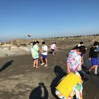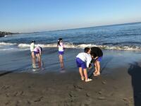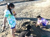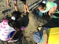 砂浜活動では、みんなと貝殻の大きさを比べたり、めずらしい形の貝殻を見せ合ったりできました。他には、潮くみリレーでくんだ水を使って山をつくって、四方向から穴をあけてトンネルをつなげたり、足首まで水につかったりできて気持ち良かったです。