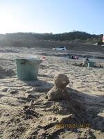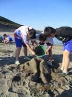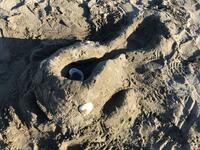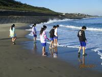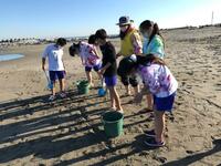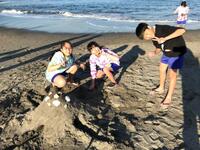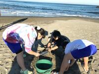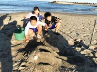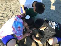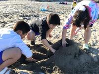 砂浜活動では、みんなと貝殻の大きさを比べたり、めずらしい形の貝殻を見せ合ったりできました。他には、潮くみリレーでくんだ水を使って山をつくって、四方向から穴をあけてトンネルをつなげたり、足首まで水につかったりできて気持ち良かったです。